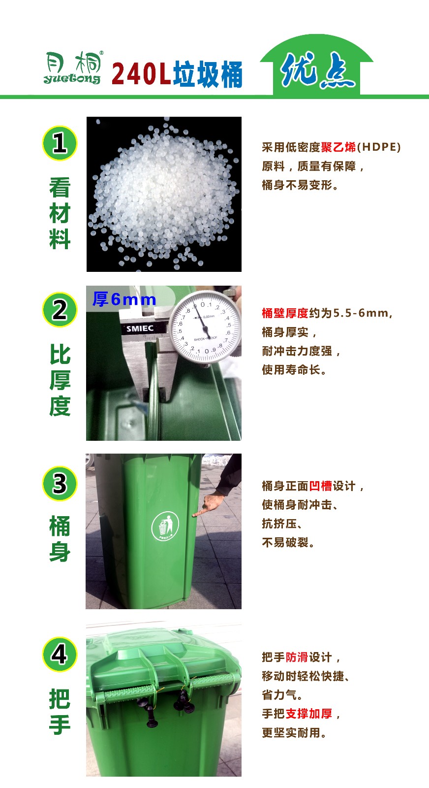 240升塑料垃圾桶采用環(huán)保材料特別加厚注塑而成,桶身表面光滑,方便環(huán)保人員清理。底部裝有靜音輪子,方便運輸,使用壽命長,可配合和垃圾車使用。適用于:物業(yè)小氣、廚房、街邊等。青島鑫金邦垃圾桶質(zhì)量無憂、信譽有保障,歡迎來電咨詢!